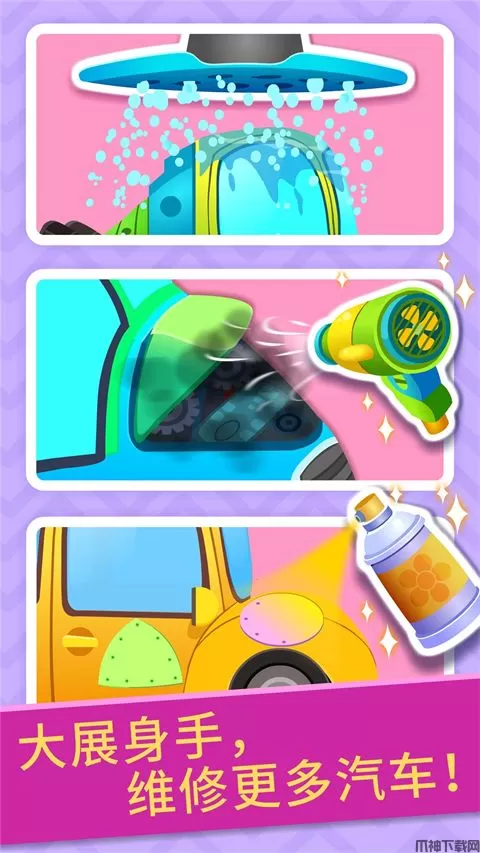 说到宝宝巴士许多小伙伴第一时间想到的是儿童启蒙教育、儿童启蒙教育游戏,为此小编今天就在这里为大家带来这款宝宝修车店,在这里宝宝扮演汽车修理师,修理汽车故障,了解车辆结构和修理方法,轻松学习汽车知识,提高动手能力。游戏中宝宝摇身一变成为一名汽车修理师,而你的目的就是修复有问题有隐患的小汽车,通过移动扫描仪,扫描小汽车,查看小汽车中的问题是爆胎和引擎故障,并对其修理,开汽车引擎盖,连接好相同颜色电线,添加机油、玻璃水等,在修理中进一步了解汽车内部构造,最后做好清洁工作打开高压水管,瞄准污渍,发射强力水柱,耶!污渍被冲走了,接着移动花洒,冲洗干净车身。擦亮车窗,清理空调灰尘,车内、车外都要清洁,汽车变得亮闪闪!除此之外,宝宝修车店游戏中宝宝还可以为汽车设计造型,金色铃铛挂坠、七彩坐垫,创意饰品,把车内装扮得美美哒!接着设计车身,挑选恐龙、火箭造型的贴纸,粘贴在车身,瞬间提升汽车时尚感。游戏模拟真实修车流程,乐趣多多,宝宝们快来体验吧!
