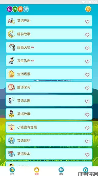2、切换到【资源】页面之后,我们还能看到各类在线资源,如英语天地、睡前故事、绘画天地等。