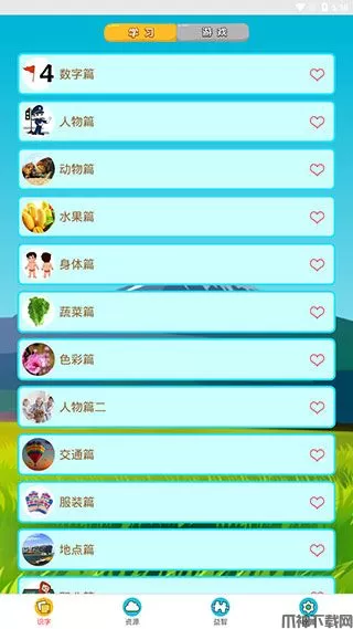 1、进入看图识字app后,找到【识字】页面,我们就能看到一些常用的学习和游戏内容,如数字篇、人物篇、动物篇等。