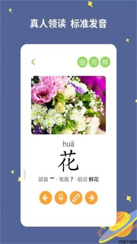 2、每个汉字均配有拼音,词组,插图,描红和真人读音,并有小游戏检测宝宝的学习效果