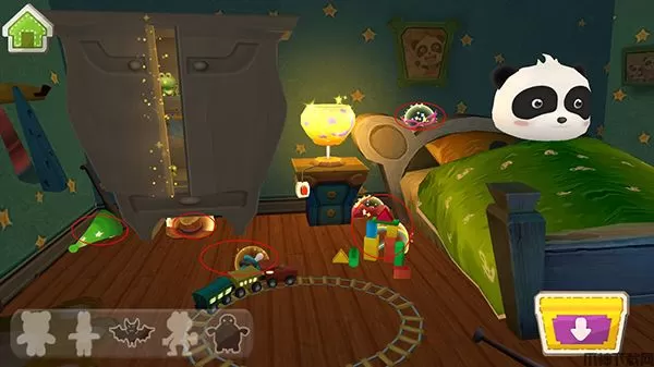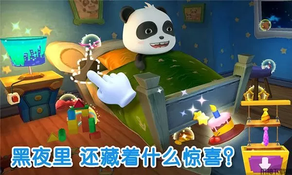在开始游戏之后会进入到3d动画页面,出现一个黑影,这个黑影把熊猫宝宝吓醒了,这时需要帮助熊猫宝宝把灯打开,点击桌子旁的红色按钮即可开灯。