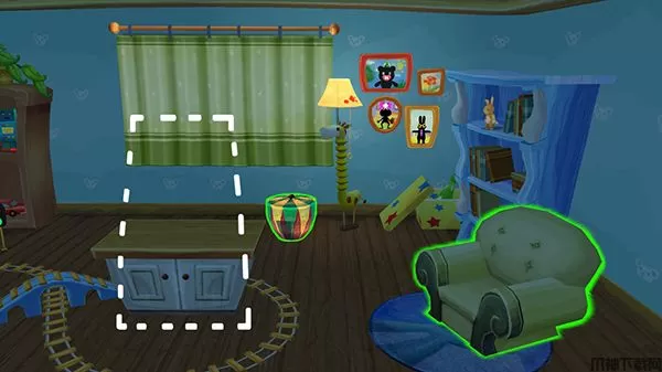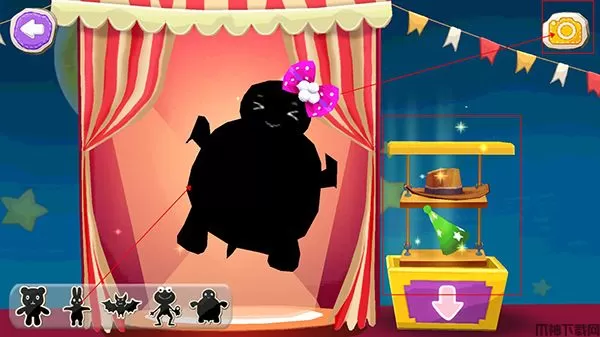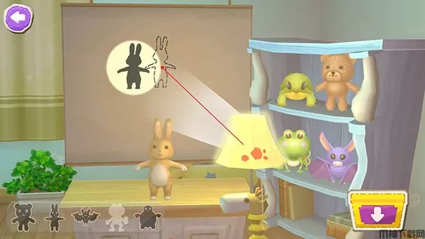收集到小兔子之后就可以点击墙后的照片,进行影子对照游戏,需要宝宝将台灯照射出来的影子对准后面的虚线,然后他们就会跳舞。在这个过程中就可以收集到青蛙影子啦!