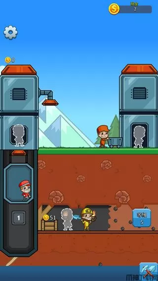 1、首先根据新手指引点击地下矿中的穿黄色衣服的矿工,然后他会进行挖矿,挖好矿后会背到左边靠近电梯的小箱子里面,这时点击在电梯中的红色衣服矿工,他会把箱子里面的东西传送到上方机器里面,然后点击在地面推小车的红衣服矿工,他会推着小车到机器下面接金币,送到原地。这三个矿工的规律性比较强,下面黄色的矿工可以一直进行挖矿,然后电梯里的矿工只需要吧挖好的矿石进行往上运送即可,地面上的工人,在机器下接住矿石推回原地就可以获取金币。