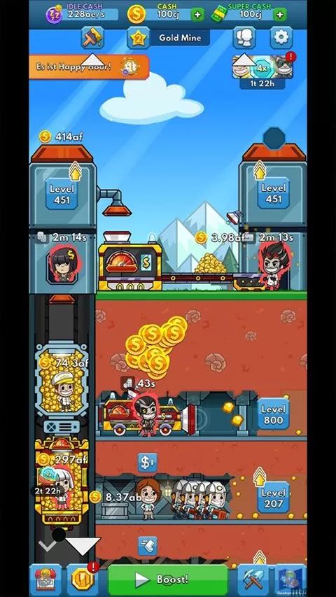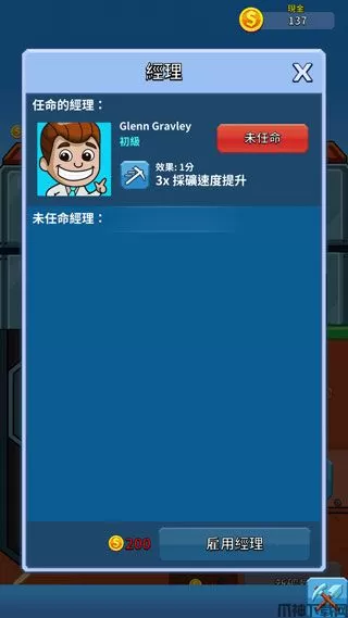 3、电梯运输和地上的运输工需要480个金币才能进行升级,可升级运输速度,运输量,运输工人数等等。在玩家们攒够金币后即可开始升级。当经理头上出现小锤子的图案时,点击小锤子可以对开采的矿工进行加速,不过只有60秒的加速时间。黄色的矿工的箱子里最多可以装1k的金币,电梯的也是,地上推小车的矿工也同样。把屏幕往下滑,下面都是未开采的矿区,矿区2在你收集到1k金币后就可以开启。所开放的矿区越多,你收集的金币也就越多,当你雇佣了经理后,矿区就会一直开采,你离开游戏以后,矿区经理会进行监督,你回到游戏界面以后点击收集,你离开是所开采的金币就会全部被收集。