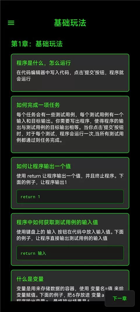 第一关只让你习惯两件事:输出靠 return,不是print或者console.log;游戏键盘里没有分号。