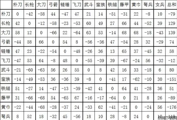 兵种相克表: 以朴刀、武斗、藤甲为代表的短兵器;
