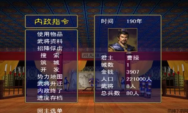 每年进入一月时就会进入内政经营模式,此时,玩家所占领的城市都会有税收进帐。在此模式下,可以进行搜索和内政开发等内政指令。每个武将每次只能执行一次内政指令。如果有武将正在出征的路上或在内政期间没有进城,则该武将便不再能执行内政指令。