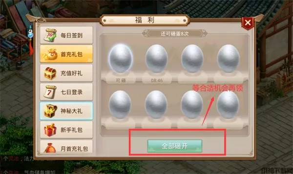 但是当我们做了几分钟主线任务时,福利那边会弹出红点,其中的神秘大礼会提示我们可以领取了。这时候千万不要领!因为神秘大礼的奖励是根据人物等级计算的,当我们升到一定等级后领取效果更佳。
