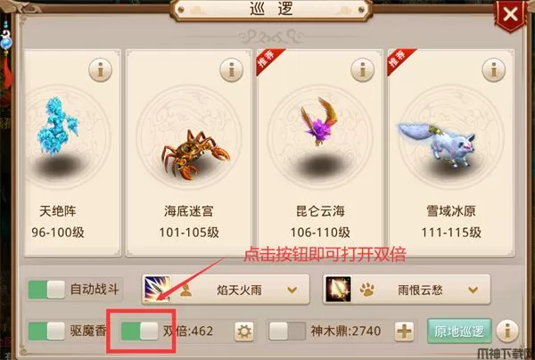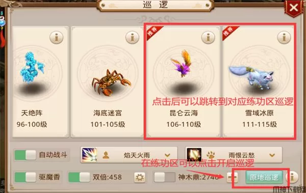 点击对应练功区便可以进入并自动进入巡逻状态,如果已在练功区中,可以点击原地巡逻按钮开巡逻。