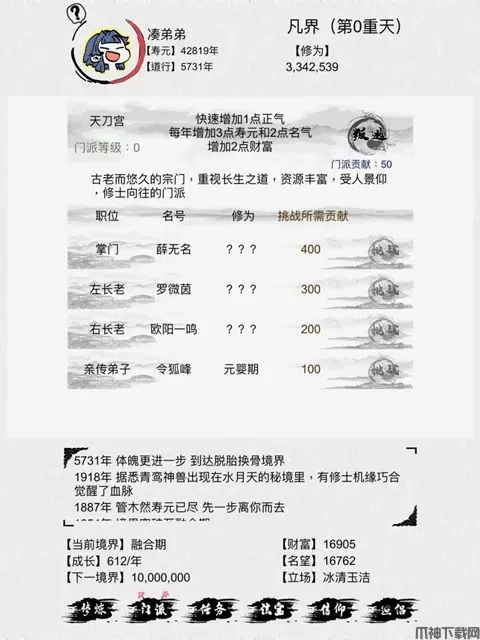 门派是每一重天必不可少的,我自己通常会一直等5级门派,每一次拜师学艺都要100年。但是不推荐0重天刷5级,0重天的寿命会不停扣,可以暂时加一个门派续命,然后再找5级门派。肯定有人会说,为什么要5级门派,我也不知道这是为什么,我猜居然门派有等级之分,那么肯定是有什么原因。于是我就顺便找了几个门派(忘了是几级的了)探究了一下,首先有的时候进去门派是没有门派任务,这是bag,并不是表明本门派没有门派任务,遇到这个情况只能重新加新的门派。没有门派任务的门派,相当于得不了奉献,没有奉献就说明挑战不了门派里的人,相当于废的。然后还要的门派任务奖励不好,5级门派任务是金色的,而那些都是绿色、蓝色的,不太好。所以有能力的我推荐5级门派。