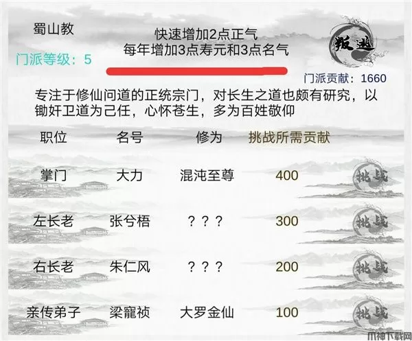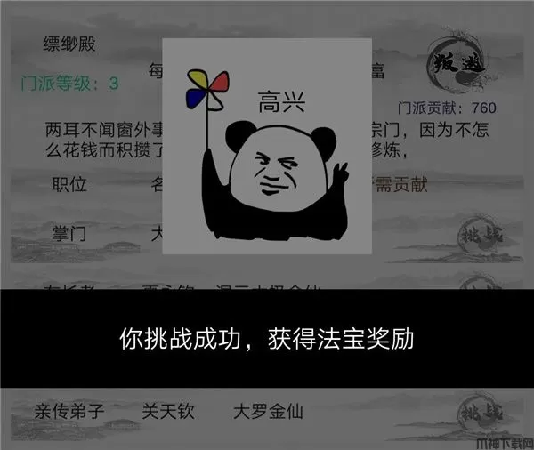 门派挑战可以得法宝,但是你要挑战完所以的门派角色必须要到倒数第二境界,所以我一般一到第二境界就打完所以,然后赶紧叛逃门派找第二个门派。因为挑战门派角色可以得法宝,打完后就跑,这样当你到下一重天之前就可以得8个法宝了,这样你现在带那一个法宝的选择就多了一些。当然背叛门派也有可能扣修为,也可能减少名望和寿命。尽管扣除修为、名望和寿命的几率不太大,大部分都是没有惩罚的,但是还是要慎重考虑一下再退出。所以这个方法我自己还是不大推荐给大家,万一你本来可以飞天结果扣修为就不好了。