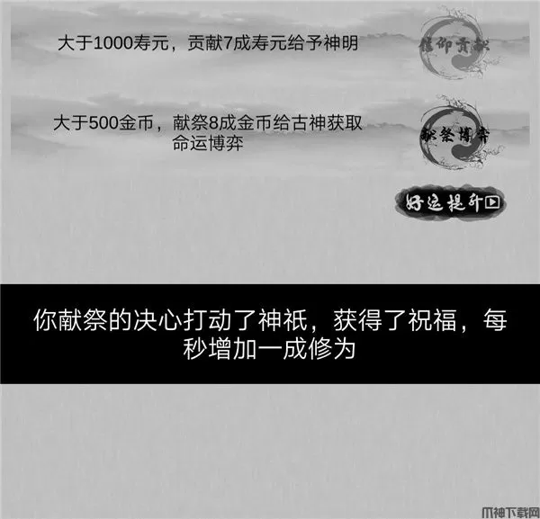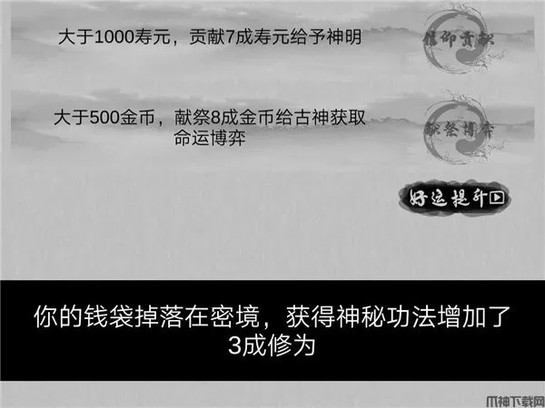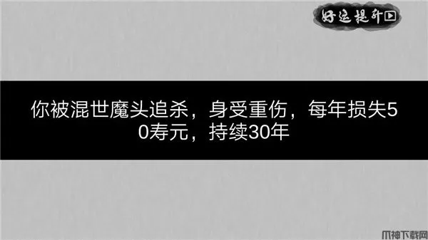 还有不好的效果,扣几成修为,八成金币不见,道侣背叛你并偷袭你扣五成寿命(虽然说背叛,但是道侣并不会离开,就是找借口扣寿命),还有一口气扣九成修为和二成寿命。还有就是碰到大魔王,就是用寿命博弈的时候就几率刷出了被大魔头追杀,每年扣50寿命,而且还要被扣三十年。我想有好的玩家都刷到过这个,被大魔王追杀,我也刷到了好多次,留下了好多阴影。有时候刚刚刷完寿命就来一个大魔王,根本承担不了。