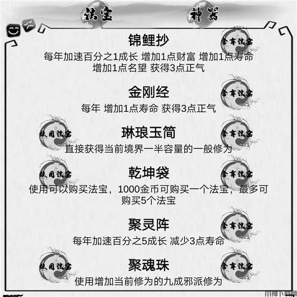 法宝获得技巧每去秘境探险都会得到法宝,不过都是随机的,去秘境的门槛会随着你境界变。假如你离下个境界还有100,那么秘境门槛就是50;假如你离下一个境界还有1000,那么秘境门槛就是500。所以在前期最好先刷满5个法宝,因为到后面要的修为也越来越多,也越来越来存了。后期可以通过挑战门派的入门弟子来得法宝,推荐从下面慢慢挑战到上面。法宝可以增加寿命,名望,财富,正气,邪气什么的加持,还可以增加少许的成才加持。也有比较特别的,直接增加九成邪派修为,直接获得1000金币,每1000金币换1个法宝(最多5个)等等的法宝,所以法宝是不可以缺少的。