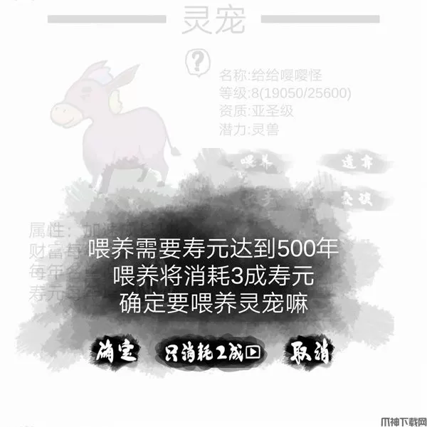 灵宠要金丹(第0重天)才能得,每一次要一百年。灵宠可以喂养,但是至少要500寿命,就会消耗三成的寿命,看广告就可以从三成减少到二成。灵宠等级越高,喂养得的经验就越来越多,一开始喂养就只能得350,有可能一开始一看只能得350就不喂养了。但是后面会越来越多,所以可以放心去喂。我一开始也是一看就350就放弃喂养,以为就只有350,就一直用寿命肝信仰去了,都不去喂养灵宠。所以我推荐刷完信仰之后剩下的寿命刷一下灵宠,这样灵宠等级就上升的快,灵宠有寿命,成长,财富等加持,等级越来越高,加持也越来越好。还可以去门派进行抢夺灵宠,而且灵宠还有散步,散步有可能加经验当然也可能减经验,所以我推荐喂养,因为喂养不会减经验只会加经验。