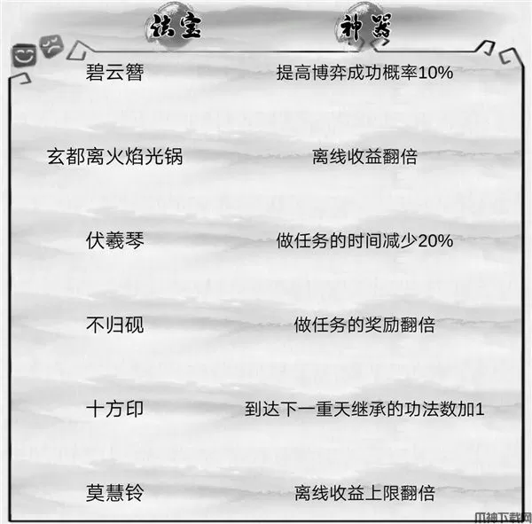神器每突破一重天就可以得到一个神器,神器也有不同的效果,有博弈几率增加百分之十,有秘境开启的时间减少百分之十,每一次到下一重天额外带一个功法,初始财富增加100,下一境界修为可以减少需要修为的百分之十,离线修为翻倍等等。