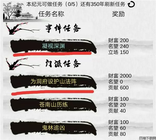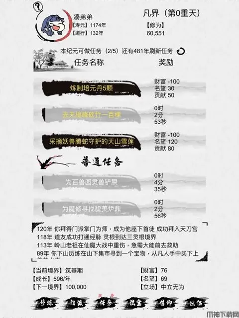任务每纪元可以做5次,任务可以获得财富,名望,立场(负的立场算邪,正的立场算正,立场决定你可以加入那种门派,负的只能加入邪,正的可以加入正教和中教,个人比较推荐正,因为正立场好得一些)和贡献(只有门派任务可以得)。而且有时候还要事件任务,都是值得可以做做的。蓝色的是事件任务,金色是门派任务。事件任务是随机出现的,门派任务大多数是固定的,门派任务中第一个是不变的,奖励也是门派第一个最丰富。(虽然得的名望是零,但是名望得了也没有多大的用处,所以要不要无所谓)但是这个认为要到渡劫期,渡劫期相当于第0重天的最后一段,所以这个任务在第0重天几乎没有时间做。做了也带不了到下一重天,只能第0重天以上可以做。