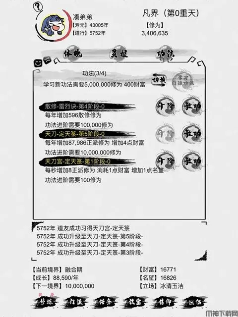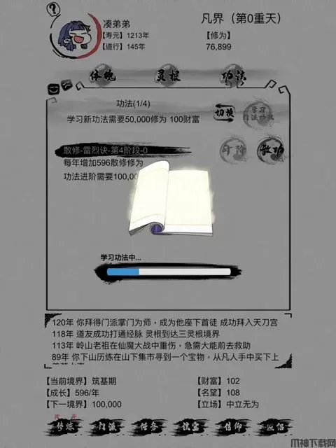 功法可以每年给你提供大量修为,财富,寿命等,当然不是所以都是正面的加持。最好学习门派功法或者双修功法,不要学习散修功法。散修功法不能只能加修为,加不了财富,寿命什么的,加的修为也没有门派功法和双修功法多。门派功法和双修功法都是随机得的,并不一定那个一定比哪个好,要看运气。