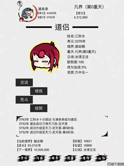 道侣要元婴(第0重天)才能拥有,我们可以和道侣进行修练,可以加一些修为,这个和道侣修练每一百年才能修练一次。而且还可以与道侣进行死斗,胜利了可以获得道侣七成修为,失败了还失去七成修为和寿命。而且拥有道侣还用少量成长加成,如果你不想道侣死,还可以与他进行结契,这样道侣就会和你共享寿命了。个人不介意结契,这样你就玩法享受击败道侣得的修为了,而且解除结契还会扣寿命。道侣如果比你的境界高,那么修练效果越好。在你刚刚开始一个重天的时候,不要着急进行修练,因为你会直接进好几段,这样去秘籍得法宝就困难了,建议先得几个法宝再与道侣进行修练。与道侣的默契度越高那么修为加成也越来越好,与道侣交谈可以增加默契度但是也会减,有时候会发生事件,可能减也可能加。