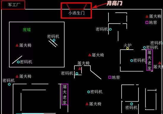 军工厂大家比较熟悉,两个门的位置基本成面对面的方向,而其中一扇逃生门我们称之为”月亮门“只要朝着月亮的方向走,就能找到门的位置。