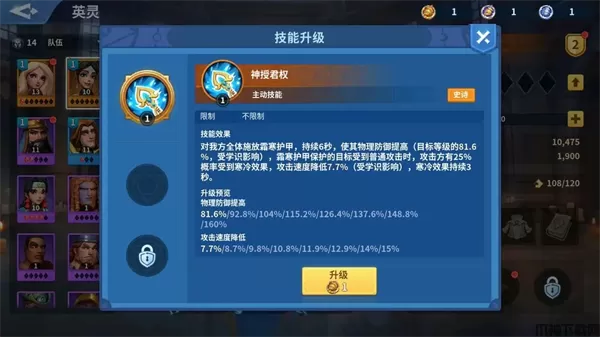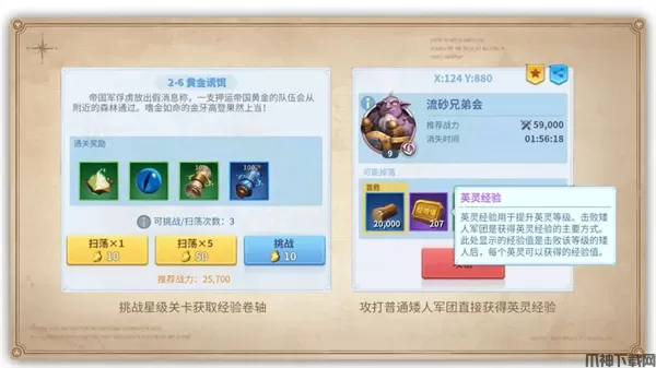 升级能提高英灵战力及带兵数量,战斗中英灵的血条用于反映带兵量的变化。击败地图上的普通矮人军团可以直接获得英灵经验;挑战时光之井中的星级关卡可获得英灵经验卷轴,需要在英灵升级面板上手动使用。