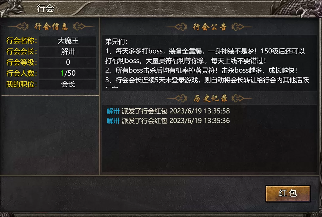 最直观的显示,我们可以看到目前行会名字、会长和公告信息,在这个页面,会长可以进行行会公告的编辑。