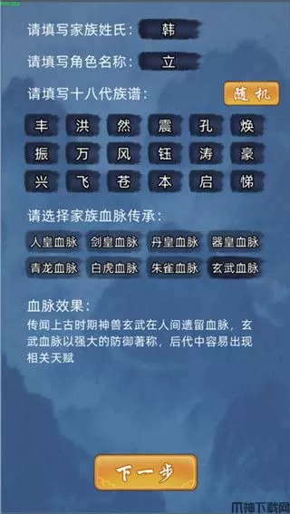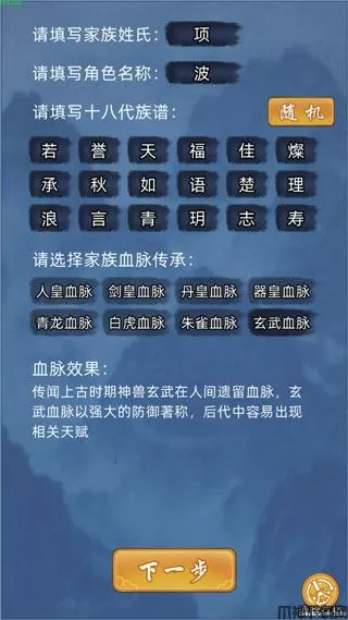 根据玩家自身情况输入姓氏、名称以及族谱等信息,选择好后点击下一步按钮