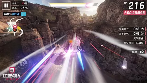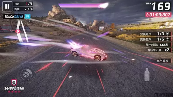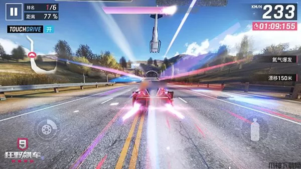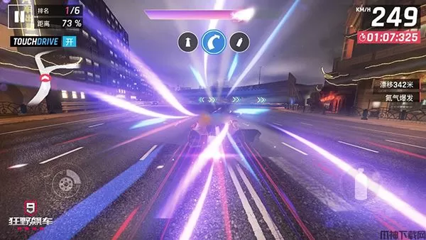 在这款游戏中,比赛是的一些细节做得非常不错,尤其是碰撞的时候,系统会给出慢放镜头供玩家欣赏。不过最喜欢的就是氮气加速时的效果,普通氮气和完美氮气都没有什么特殊的效果。唯独氮气爆发,在点击触发的时候,就像是在赛车前开了一个穿越的虫洞一般,在赛车奔跑时,紫色炫彩的流动线条,给玩家不一样的视觉体验。