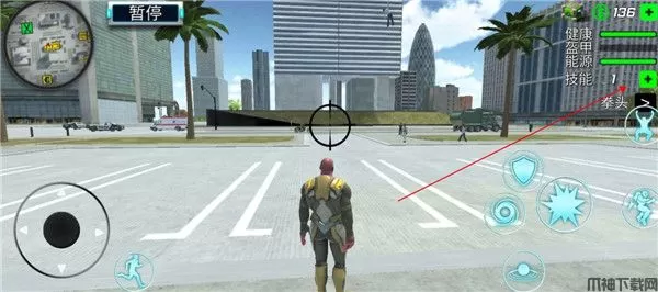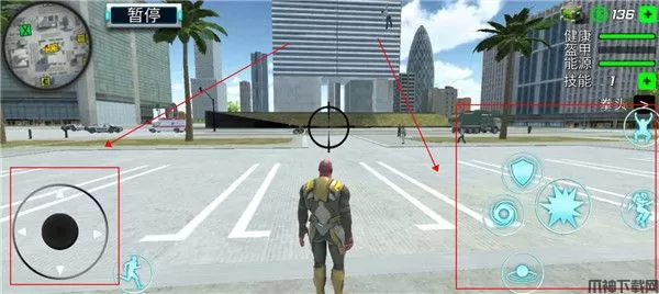 4、然后我们返回游戏界面,左边的摇杆是控制方向的,而右边则是我们的各种技能