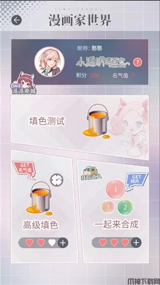 5、点击“漫画家世界”可找到“一起来合成”和“高级填色"游戏。一起来合成用于合成碎片,用碎片兑换相应物品,即可用于解锁剧情。