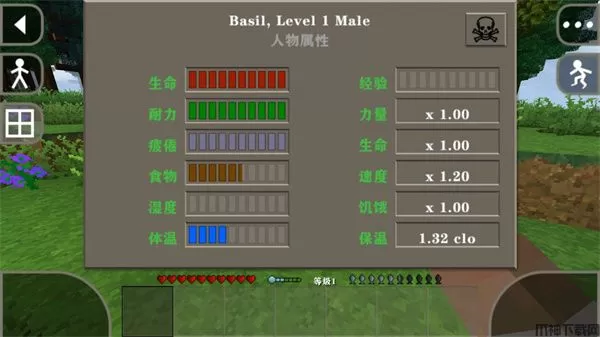 7、点击人可以查看人物属性,例如生命、耐力、食物、经验等等;