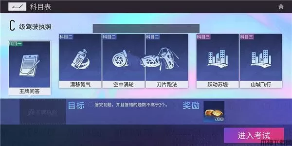 而驾照考试一共可以分为4种,分别是C级的初级驾照考试、B级的中级驾照考试、A级的高级驾照考试、以及S级的超级驾照考试,通过这四种考试将可以分别拿到相应等级的驾照。