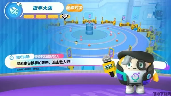 扳手大战生存模式巅峰对决关卡的地图以蓝色为主,风格相对清新,地图整体为圆形。比赛一开始,每只小蛋仔都会获得扳手这个道具,作为自己的投掷物品,来打击对手的重量值,重量值被打光之后,蛋仔将会很容易被击飞以及淘汰。同时这张地图的地板也会逐渐掉落,增加游戏难度。