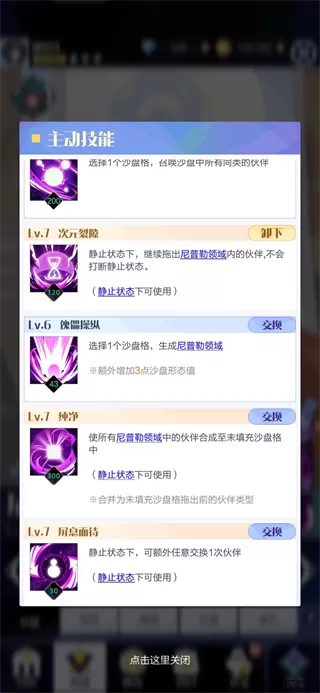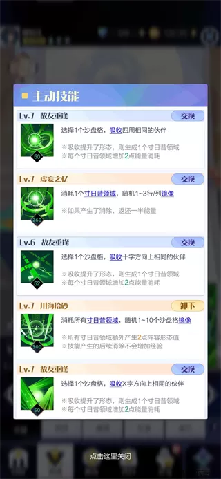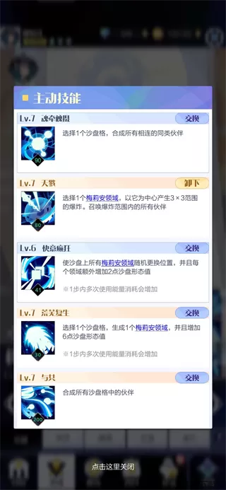 这套技能组旨在使强伙伴的方块通过镜像的方式覆盖大片沙盘,从而合成高级伙伴。三个消除类技能选择手感合适的即可,虚妄之忆用于能量不足的情况进行小规模镜像(如竞技场中每轮稳定爆发),可按个人喜好替换为消耗类技能