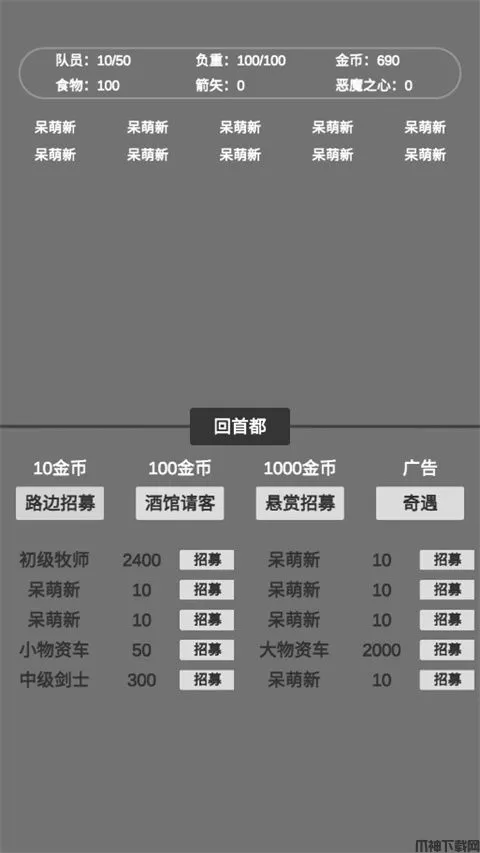 4、点击路边招募,这里可以招募初级牧师、呆萌新、小物资车、中级剑士等队员,但是也要看自己的金币够不够;