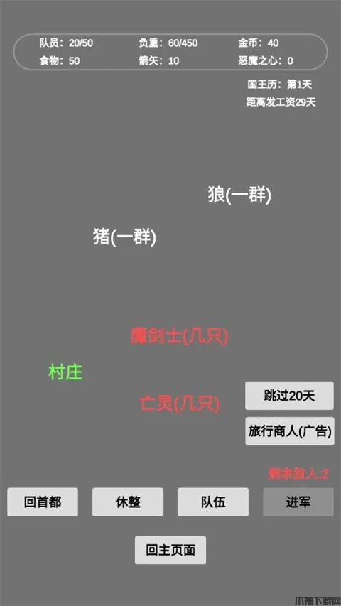 文字恶魔城中玩家开局就会成为国王,你需要招募士兵,打造豪华队伍阵容出征狩猎,狩猎获取的多余食物可以前往市场进行交易出售,赚取金币购买自己所需的各种道具与食物,快去招募你的伙伴出发吧,出发前记得带足粮食和其他消耗品。喜欢的玩家不妨下载体验一下试试看吧!
