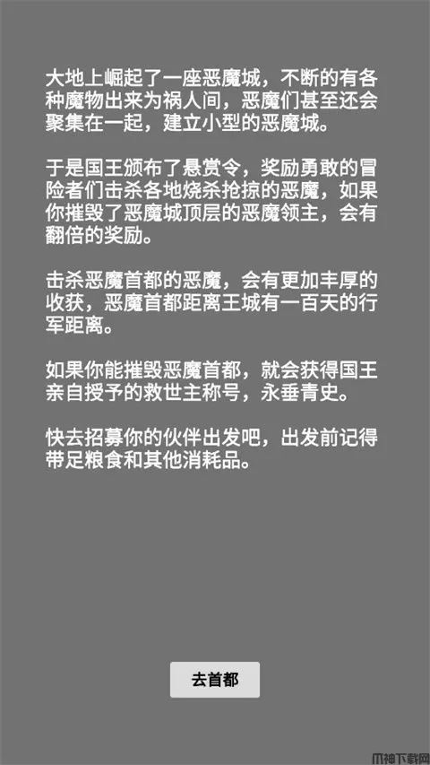 文字恶魔城游戏背景讲述的是大地上崛起了一座恶魔城,不断的有各种魔物出来为祸人间,恶魔们甚至还会聚集在一起,建立小型的恶魔城。于是国王颁布了悬赏令,奖励勇敢的冒险者们击杀各地烧杀抢掠的恶魔,如果你摧毁了恶魔城顶层的恶魔领主,会有翻倍的奖励。击杀恶魔首都的恶魔,会有更加丰厚的收获,恶魔首都距离王城有一百天的行军距离。如果你能摧毁恶魔首都,就会获得国王亲自授予的救世主称号,永垂青史。