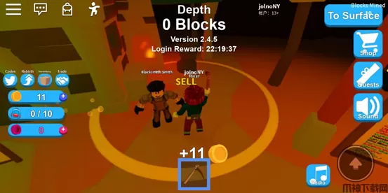 1、一开始,我们能获得初始两件套——木镐和10容量的背包。我们用木镐去挖矿,装满背包后去卖掉换成金币,然后去购买更高级的木镐和容量更大的背包,这样就能加快金币的获取速度,利用现有的道具让自己富有起来!