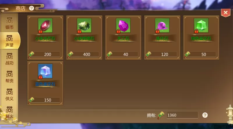 活动资源类的货币可以说是游戏的特色,可以用于商店,它们共有五种:帮贡、侠义值、战功、声望、篝火币。