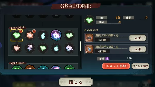 除此之外,还可以在这个界面中对GRADE进行强化,通过消耗通关获得的各类材料提升属性,在完成一个阶级后还能解锁等级上限。