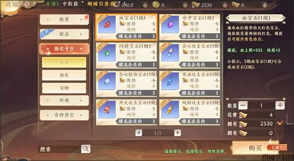3、接下来装备前期以门派套装为主,后期通过各种刷副本再逐渐更换,宝石反倒是对战力影响很关键的地方,镶嵌时候一定要掌握技巧。优先将低级宝石平均镶嵌到不同装备上,一定要做到每个镶嵌孔中都有宝石。这样后期在获取更多之后逐个提升,不仅收益最高,还有额外属性加成。这些方面全部做到位之后,接下来只需要每天将日常活动刷一遍,尽量选择实力比较强的队友去打挑战副本。