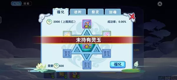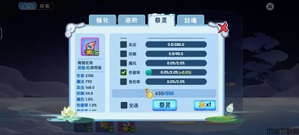 (3)祭灵,跟问仙类似,勾选想要提升的属性进行祭灵,每次消耗一定数量的“灵质”(初始为500一次),每多勾选一个词条进行提升,消耗的“灵质”数量就会相应增加。