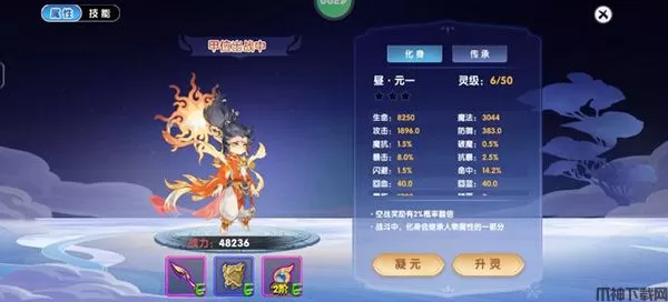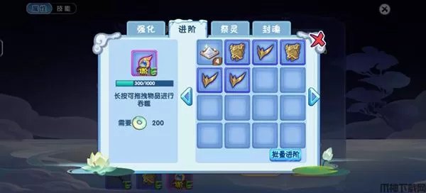 (2)进阶,这个没啥多说的,进阶所需经验跟魂器进阶一样,多余的化身装备都可以用来进阶,进阶能提升装备的属性。一个装备固定提供80点经验。进阶一次固定消耗200“华玉”。