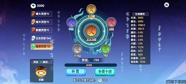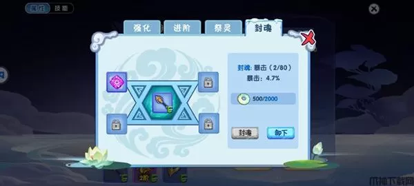 (4)封魂,相当于化身装备的启灵珠,通过各种渠道获得封魂印,目前一个装备上只能放一个封魂印,消耗一定数量的“华玉”进行封魂,可以提升封魂印的属性。每次封魂后消耗的“华玉”数量会相应增加。