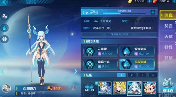 3、首先小伙伴们根据亚比之间的属性可以进行阵容的搭配。举个例子:水系亚比古渊露龙,这个亚比的大招是可以增强水系跟冰系亚比技能威力的,如果我们阵容上带了这只亚比,那么其他亚比就可以优选选择水系跟冰系。(注意:可以让古渊露龙第一个上场释放大招之后再换其他亚比,因为这只亚比的大招可以持续10个回合)