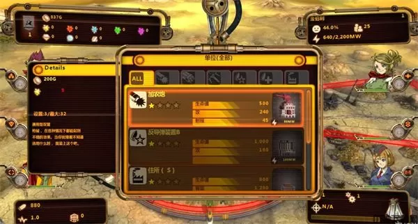 3.绝对迎击兵器:剧情第一次打败BOSS后可开发,独一无二的超级武器,需要依靠杀敌收集能量来充能,只有充满后才可发射,充满后的能量够放2发,按方块键进入发射界面手动瞄准,可以只放一发后按叉键退出。伤害极高,BOSS战时请不要乱用