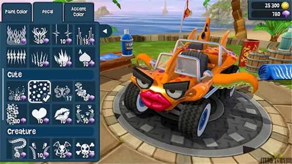 4、打造疯狂的集合,就像疯狂躲避球,火球和浮油。解锁和升级各种赛车,从沙滩车到怪物卡车。