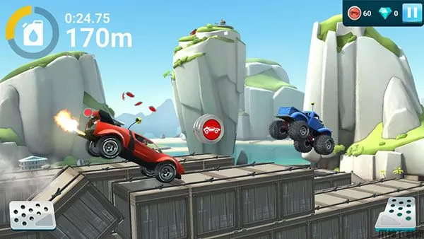 2、踩下油门,全速前进,在需要真正驾驶技能的赛道上赢得令人胆战心惊的PVP比赛。跳过坡道,飞越各种障碍并取得方格旗。