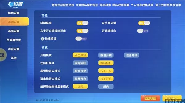 2.基础设置。基础设置,你们会看到功能功能里面没有什么好讲的主要就是辅助瞄准是要开的,因为这样子可以更好的射击对手,更容易精准的击败对手。模式里面开镜就点那个,点击开镜,因为新手还不是很奇怪按住开镜和混合开镜。陀螺仪的话,新手基本上不太会用的,所以就直接关闭。
