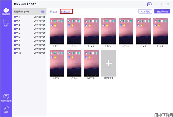 1、勾选需要安装应用的设备后,点击【批量上传】按钮