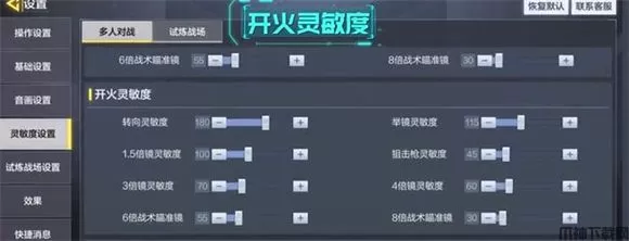 2、开火灵敏度:开镜瞄准下镜头的转动速度,练习的时候瞄准一个移动靶,能平稳地跟上目标即可,跟不上就调高灵敏度,每次在5-10数值之间调节,以下是开火调灵敏度: